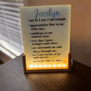 6x8 Personalized Named framed affirmations. Comes with wood stand and the option to turn light off or on.