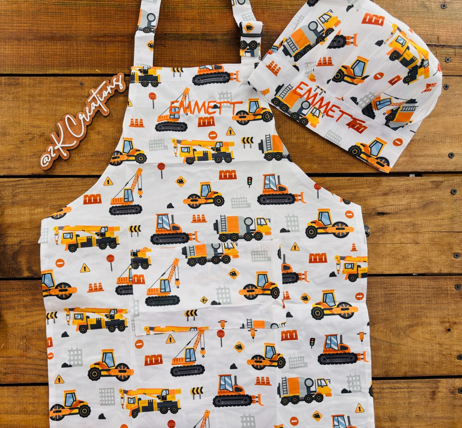 Tonka truck embroidered chef apron and hat set.
